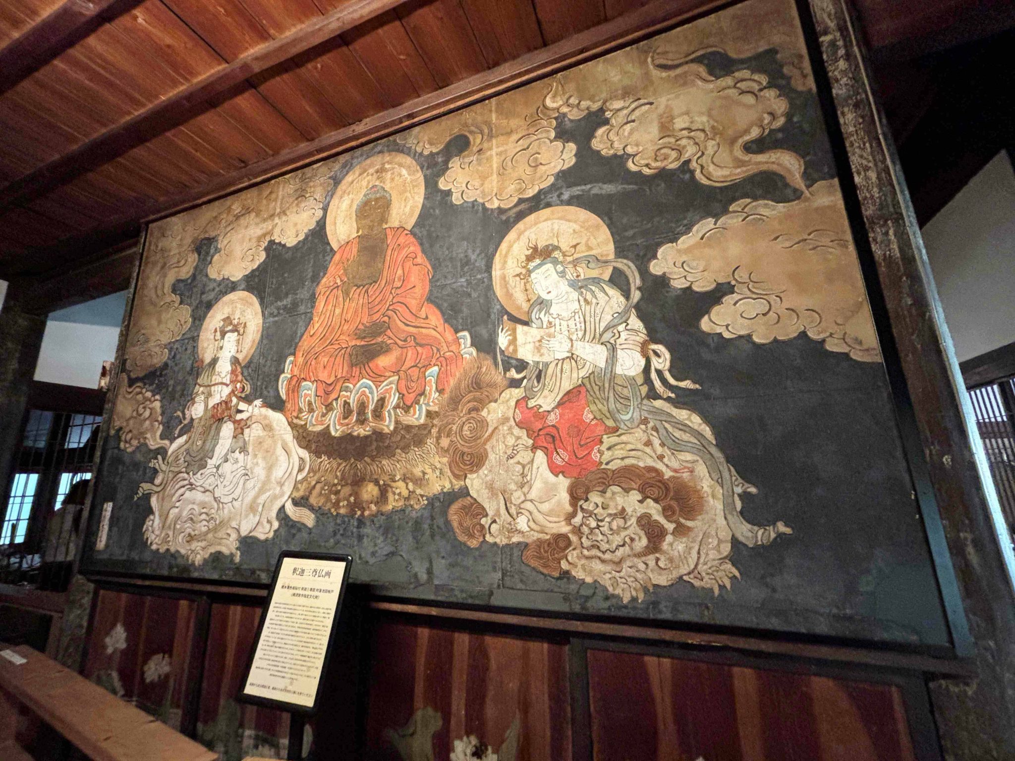 釈迦三尊図は、本堂の来迎壁背面に描かれているもの。1837年の制作で鎌倉在住の戸川(長谷川)雪貢の筆。